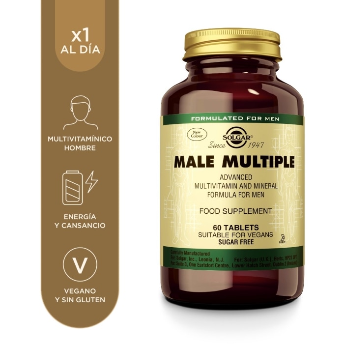 Male Multiple de Solgar® es un multivitamínico y mineral diseñado específicamente para el hombre. Un avanzado complejo multivitamínico con una formulación cuidadosamente elaborada y adaptada a las necesidades nutricionales de los hombres. Contiene más de 20 nutrientes diferentes y está formulado específicamente para ofrecer un complemento nutricional a los hombres que llevan un estilo de vida activo. Entre ellos, vitaminas del grupo B que ayudan a la producción de energía y al funcionamiento del sistema nervioso; zinc, que contribuye al mantenimiento de los niveles de testosterona, vitamina C, para apoyar la función del sistema inmunitario también durante el ejercicio físico intenso y después de este; folatos para ayudar a disminuir el cansancio y la fatiga; magnesio para el correcto funcionamiento del sistema muscular…