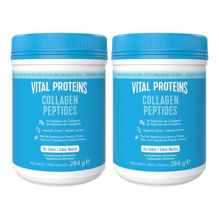 Contiene Dos botes de Vital Proteins Collagen Peptides de 284g sin sabor.