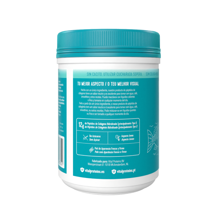 El Colágeno marino de Vital Proteins Marino se extrae de las escamas de pescado blanco salvaje, no contiene organismos genéticamente modificados (OGM), cuenta con una alta biodisponibilidad, es de fácil digestión y se disuelve en agua fría. Cada dosis te proporciona 12 gramos de péptidos de colágeno, extraídos de pescado blanco salvaje.