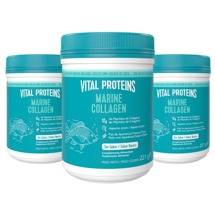 Contiene 3 botes de Vital Proteins Collagen Peptides Marino de 221g.