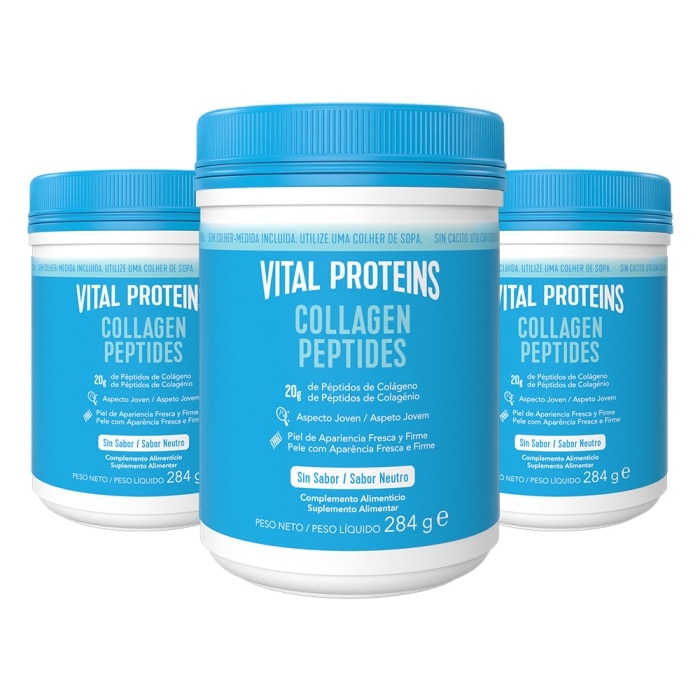 Contiene Tres botes de Vital Proteins Collagen Peptides de 284g sin sabor.