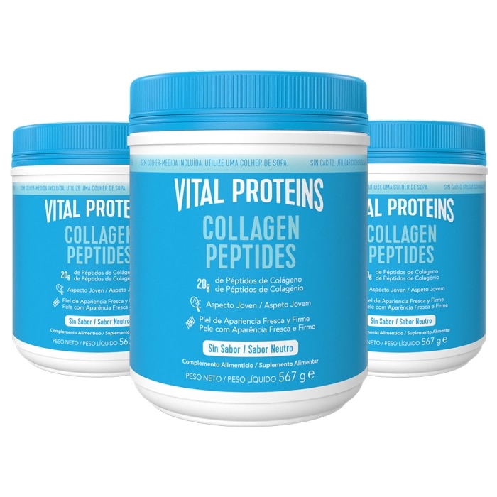 Contiene Tres botes de Vital Proteins Collagen Peptides de 567g sin sabor.