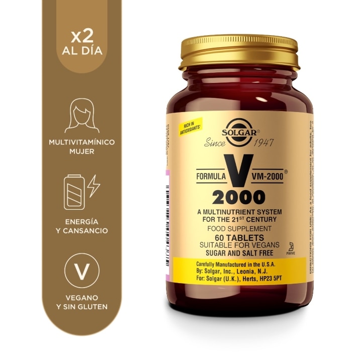 El ritmo de vida actual, el estrés cotidiano, el trabajo, el gimnasio… requiere de una alimentación equilibrada que proporcione nutrientes que ayuden al mantenimiento del metabolismo energético. El VM-2000® de Solgar® es una fórmula multinutriente de alta potencia, que incluye minerales quelados que facilitan su absorción. Un complejo multivitamínico de gran éxito de ventas, con vitaminas, minerales y aminoácidos, especialmente formulado para ayudar a la producción de energía y a reducir el cansancio y la fatiga. Con bisglicinato de hierro, una forma única de hierro formulada para conseguir una máxima absorción mientras minimiza la posible irritación gastrointestinal y el estreñimiento. Con alto contenido en vitaminas del complejo B para mantener el nivel de energía, vitamina C para ayudar la función inmune durante y después de la actividad física, y con nutrientes como zinc, cobre o vitamina E que protegen las células del daño oxidativo. Además, su fórmula incluye proteína de soja en polvo, ornitina, taurina y glutation.