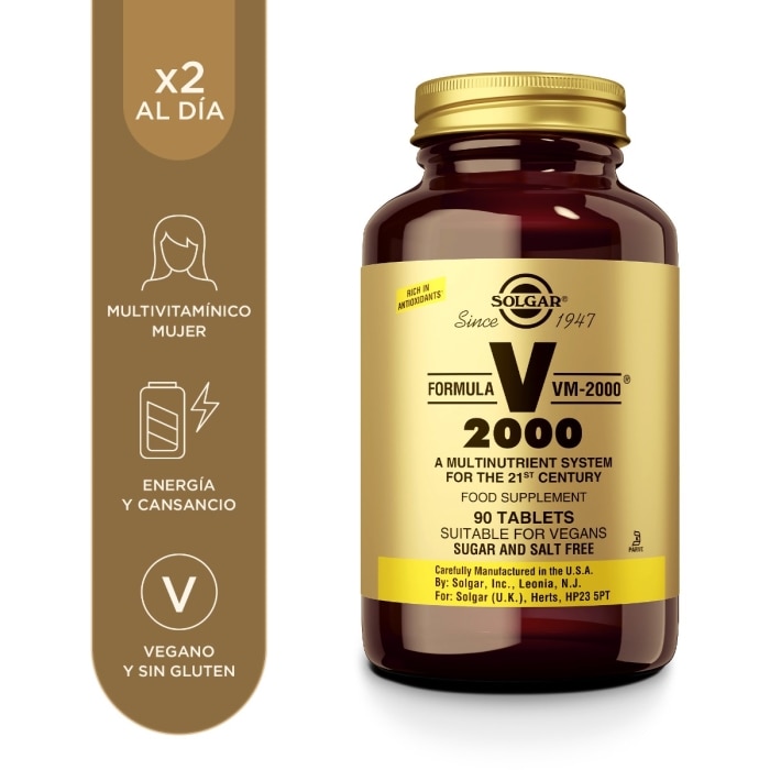 El ritmo de vida actual, el estrés cotidiano, el trabajo, el gimnasio… requiere de una alimentación equilibrada que proporcione nutrientes que ayuden al mantenimiento del metabolismo energético. El VM-2000® de Solgar® es una fórmula multinutriente de alta potencia, que incluye minerales quelados que facilitan su absorción. Un complejo multivitamínico de gran éxito de ventas, con vitaminas, minerales y aminoácidos, especialmente formulado para ayudar a la producción de energía y a reducir el cansancio y la fatiga. Con bisglicinato de hierro, una forma única de hierro formulada para conseguir una máxima absorción mientras minimiza la posible irritación gastrointestinal y el estreñimiento. Con alto contenido en vitaminas del complejo B para mantener el nivel de energía, vitamina C para ayudar la función inmune durante y después de la actividad física, y con nutrientes como zinc, cobre o vitamina E que protegen las células del daño oxidativo. Además, su fórmula incluye proteína de soja en polvo, ornitina, taurina y glutation.