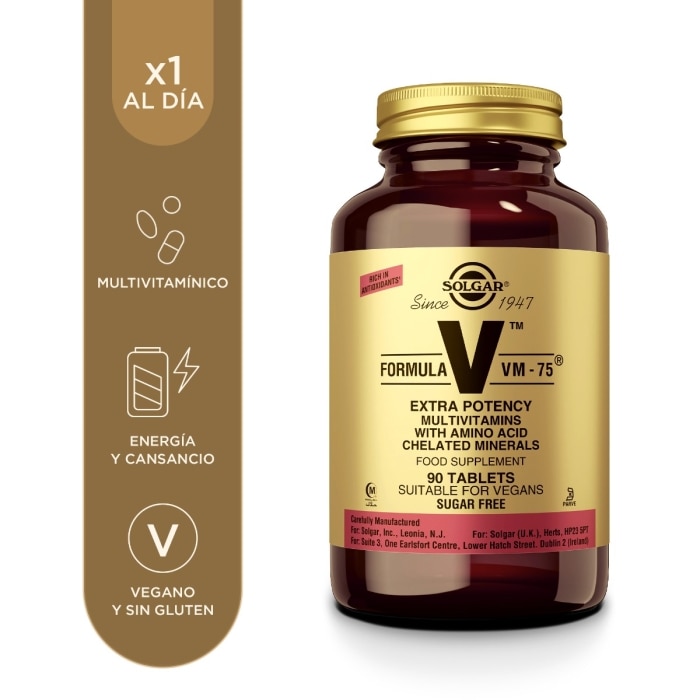 La Fórmula VM-75® de Solgar® es un multinutriente con vitaminas y minerales. De su composición destaca su alto contenido de vitaminas del complejo B, que ayudan a la producción de energía y a disminuir el cansancio y la fatiga. Además, provitamina A en forma de betacaroteno, vitamina D, vitamina C y vitamina E, que protegen frente al daño oxidativo y apoyan el correcto funcionamiento del sistema inmunitario. Fórmula VM-75® de Solgar® también contiene minerales necesarios para el organismo, como hierro, magnesio, selenio o zinc entre otros. Con minerales aminoquelados de mejor absorción y biodisponibilidad que otras formas minerales. Un producto completo y adecuado para aquellos que desean apoyar el bienestar general y buscan un plus de energía, con la comodidad de una sola toma diaria.