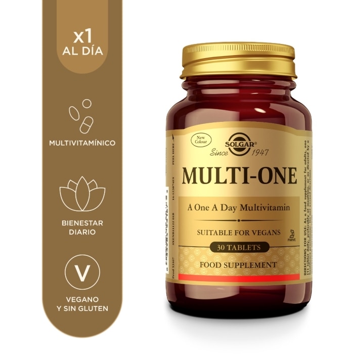Día a día, nuestro organismo requiere de una gran variedad de nutrientes para su correcto funcionamiento. Proteínas, carbohidratos, grasas, pero también vitaminas y minerales, deben ser ingeridos en cantidades suficientes. Una dieta sana y equilibrada es fundamental para obtener todos los nutrientes que necesitamos. El intenso ritmo de vida, las comidas fuera de casa, alimentos procesados… pueden alterar nuestro plan de alimentación equilibrada. Para aquellos que buscan apoyar su ingesta diaria de nutrientes, Solgar pone a su disposición Multi-One, un producto con una amplia variedad de vitaminas y minerales esenciales en una base herbal. Un solo comprimido al día proporciona hasta el 100% de las recomendaciones de ingesta diaria de la mayoría de las vitaminas esenciales y minerales que nuestro cuerpo necesita. Sus minerales orgánicos en forma quelada (para una mejor absorción) y el 100% del VRN* de vitaminas como el complejo B, la vitamina D, la vitamina E o la vitamina C, permiten que Multi-One de Solgar® apoye la producción de energía, la función cognitiva y ayude a disminuir el cansancio y la fatiga. Una manera sencilla de apoyar nuestro bienestar. *VRN Valor de referencia de nutrientes.