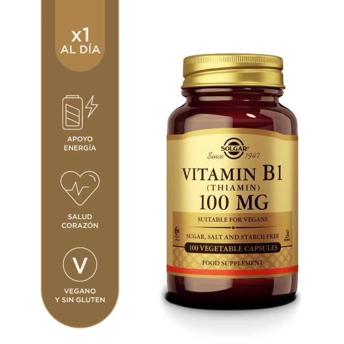 Vitamina B1 (tiamina) 100 mg de Solgar® se presenta en cápsulas vegetales que aportan vitamina B1 en forma de clorhidrato de tiamina. La vitamina B1 es una vitamina hidrosoluble del grupo B que participa en las reacciones que tienen lugar en el organismo para obtener energía, principalmente en el metabolismo de carbohidratos, y es necesaria para el funcionamiento del sistema nervioso y el corazón.