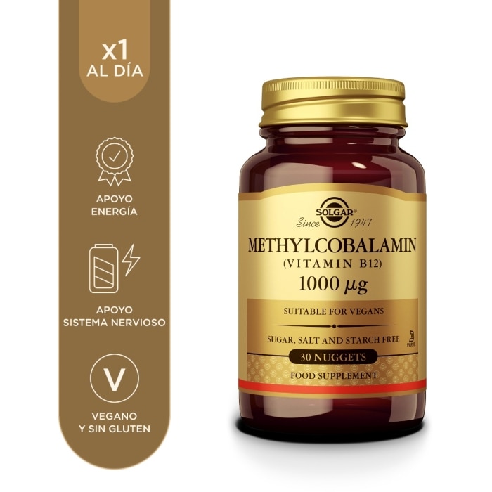 Vitamina B12 en comprimidos sublinguales-masticables de Solgar® aporta, por comprimido, 1000 μg de la forma de vitamina B12 cianocobalamina. Entre otras funciones, la vitamina B12 interviene en la producción de energía a partir de los alimentos, en el funcionamiento del sistema inmunitario y el sistema nervioso y en la formación de glóbulos rojos. La vitamina B12, una vitamina hidrosoluble, se encuentra de forma natural en los alimentos de origen animal, como el pescado, la carne, productos lácteos y huevos. Este nutriente no puede ser producido por el organismo y debe ser ingerido a través de la dieta. Por ello, es especialmente interesante en aquellas situaciones en la que su absorción está disminuida o para personas que siguen una dieta restringida en este nutriente, como la dieta vegana.